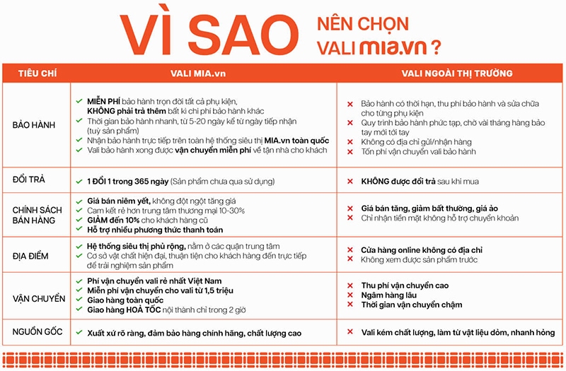 Việc chọn mua vali tại MIA.vn không chỉ mang đến sự an tâm về chất lượng mà còn giúp bạn tận hưởng những quyền lợi vượt trội mà khó tìm thấy ở nơi khác.